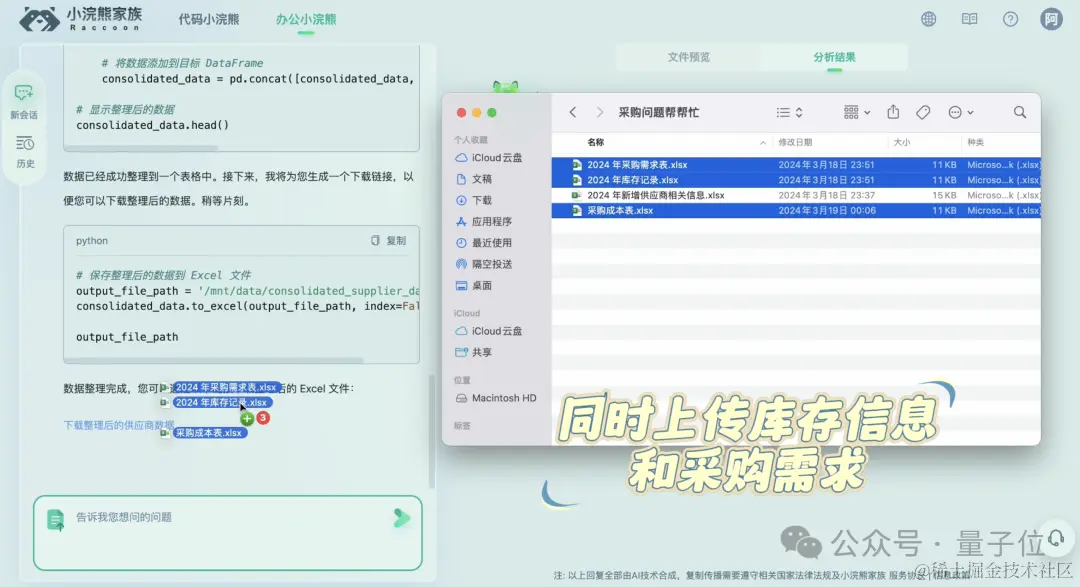 有了办公小浣熊,现在处理表格、文档甚至代码文件,都成了**“一丢+一问”**的事情了。