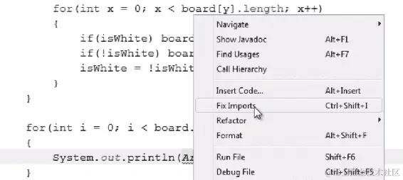 好的,我们程序的下一步是为数组中的每个节点分配字符值:黑色方块为B,白色方块为W。让我们首先编写代码使所有方块都是白色的。当我们执行双重for循环时,它将通过我们的二维数组中的每个节点。因此,每次我们执行内部for循环中的代码时,我们都是根据单个二维数组节点来执行的。为了获得这个节点,我们需要询问我们的board数组在第y行和第x列的位置是什么,然后我们将改变该节点的值: