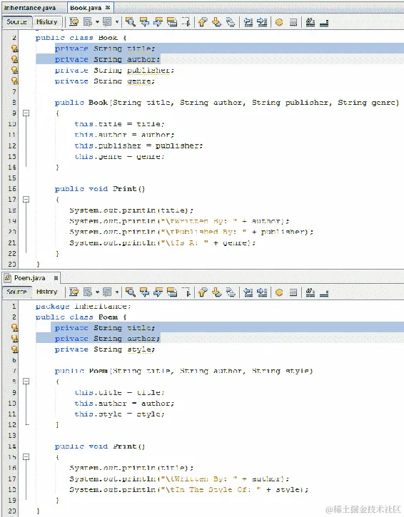 我们的Literature类包含了管理文学作品标题和作者的声明和所有功能。如果我们让 Java 知道Poem和Literature之间存在继承关系,我们应该能够删除以下Poem类的标题和作者的所有真实引用: