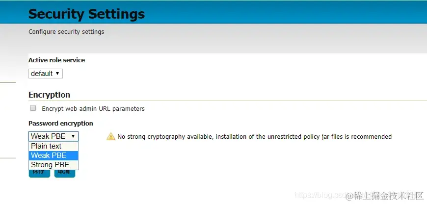 geoserver关于数据源的加密方式存在三种plain text、weak PBE、strong PBE,三种方式,geoserver默认的加密方式是weak PBE,关于加密方式的修改可以再geoserver的应用中进行修改,如图: