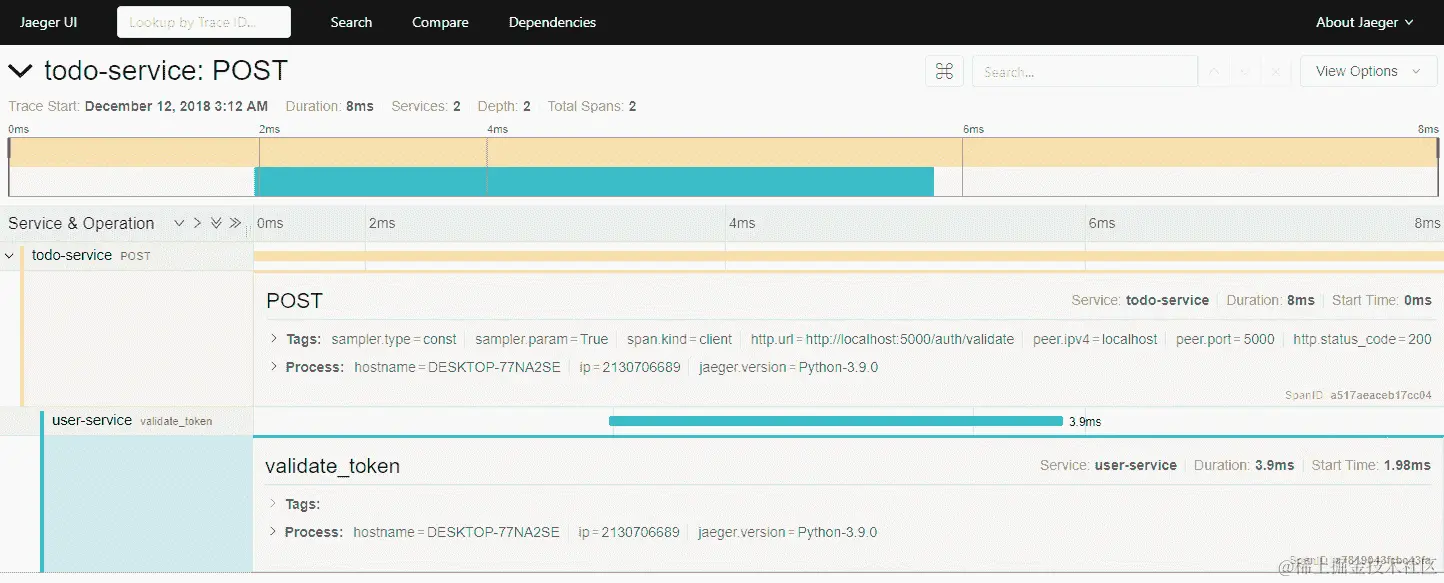 在todo_service.py文件中放置了上述代码后,我们已经启用了分布式追踪。但在看到它实际运行之前,有一些事情我们需要看一看。在上述代码片段中,我们从opentracing_instrumentation库中导入了一个额外的方法install_all_patches(),如下所示: