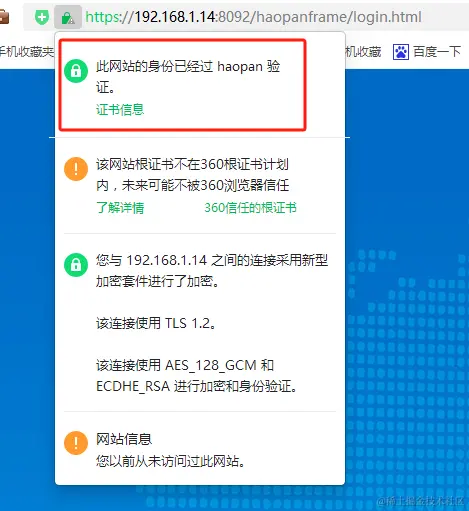 使用360浏览器访问系统后台管理地址,点击地址栏的查看证书并导出
