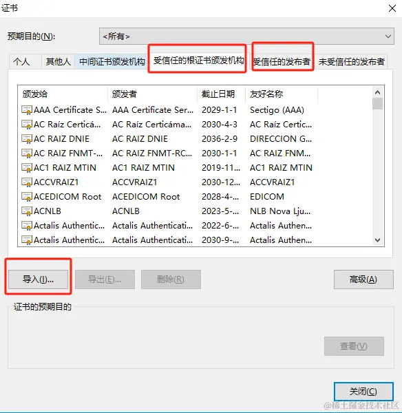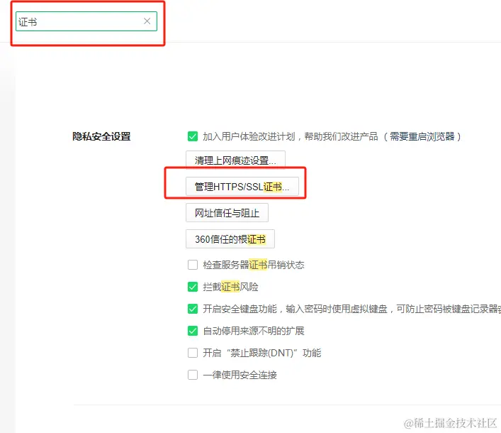 打开360浏览期设置,搜索证书,配置SSL证书,在受信任的根证书派发机构和受信任的发布者两个tab下导入刚才导出的证书