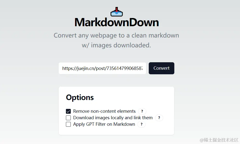 - MarkdownDown:将任何网页转换为的简洁 Markdown,只需输入 URL 即可下载,同时支持设置是否过滤非内容元素、是否下载图片等等选项。