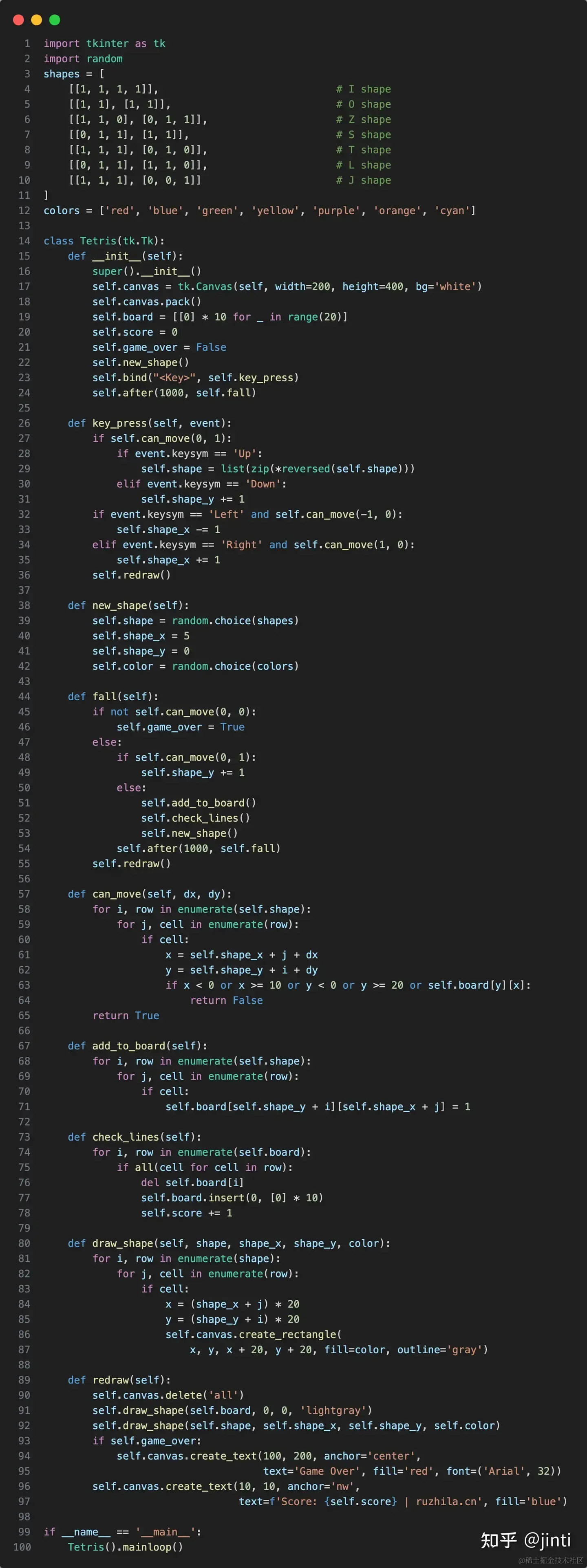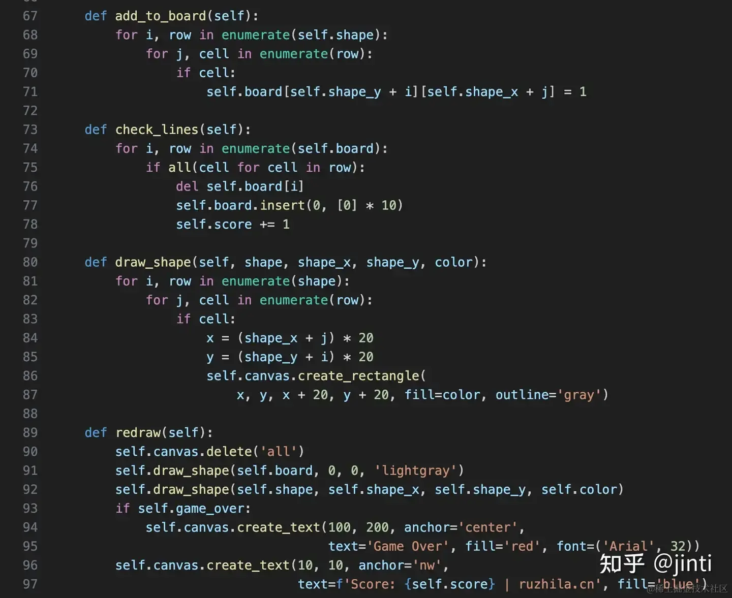 以下代码分别实现固定shape、消除行、绘制固定块(self.board)和移动块self.shape的逻辑:
