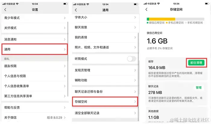 (2)在**【存储空间】界面找到【前往清理】**的选项,点击进入进行清理。该操作不会影响微信的正常使用,只是清理使用软件过程中产生的临时数据。