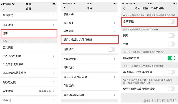 (3)我们还可以通过关闭微信的自动下载功能来减少大量数据的存储。依次单击**【设置】-【通用】-【照片、视频、文件和通话】,关闭【自动下载】**按钮。