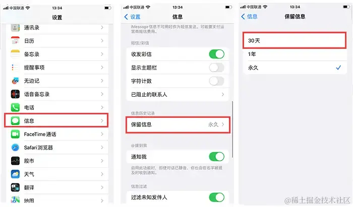手机经常会接收到很多短信,其中不乏很多广告、验证码等信息。对此,我们可以通过以下步骤来定期删除不必要的短信:单击**【设置】-【短信】-【保留信息】,信息的保留期限选择【30天】**。