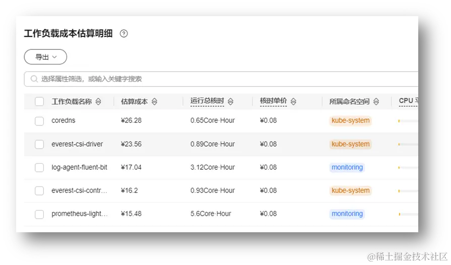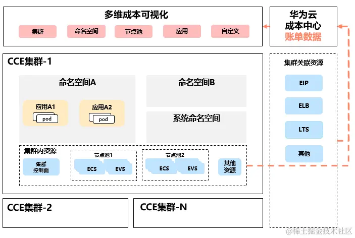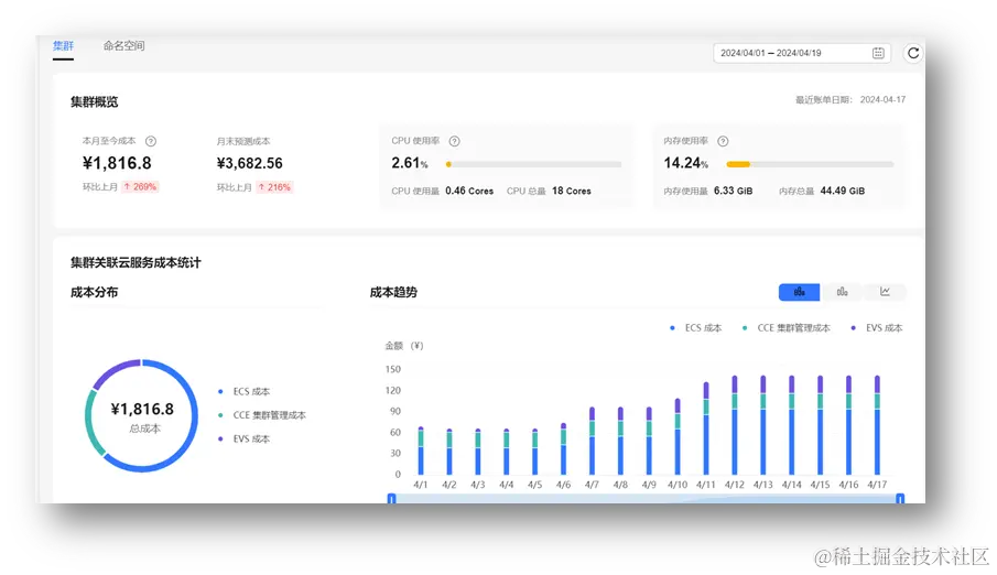 - 集群物理资源成本,包括集群直接或间接关联的资源成本,比如集群管理费、ECS成本、EVS成本等。集群的物理资源成本可以从云成本账单中直观的体现出来。