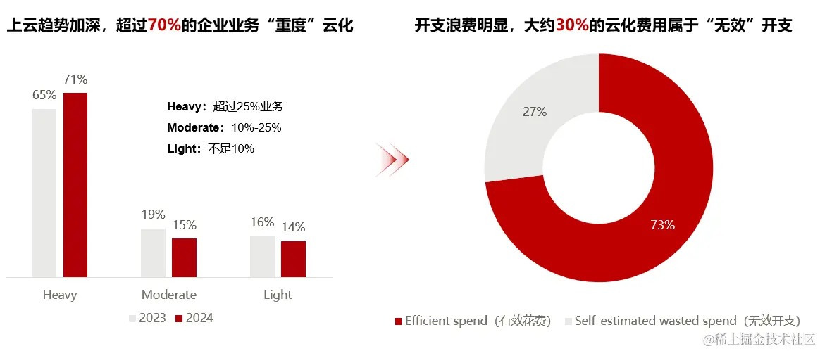 根据Flexer 2024年最新的一项调查显示,当前有超过70%的企业重度使用云服务,而这个数据去年是65%。由此可见,越来越多的企业开始把业务部署在云上。企业在使用云厂商提供的云服务的同时,也在为云服务的花费买单。调查显示,平均大约有30%的云成本支出被认为是无效支出。如何节省云成本支出成为近几年上云企业最关心的Top1问题。
