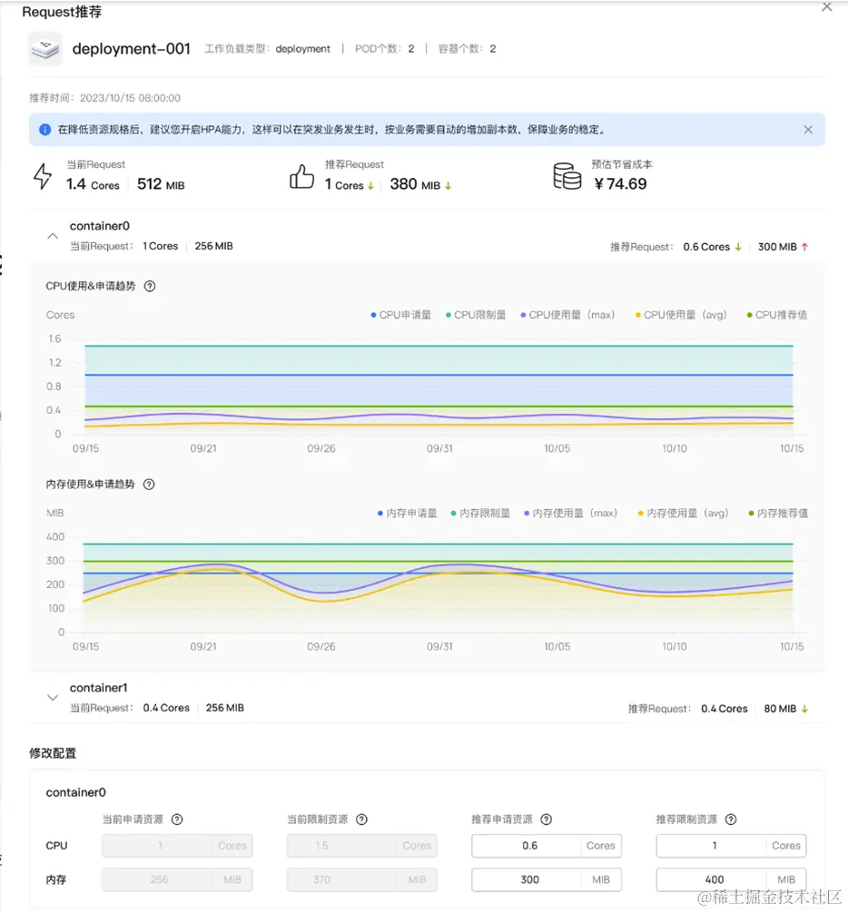 为了保障应用性能和可靠性,同时由于缺乏足够的可视化工具,我们总是倾向为应用申请过量的资源。为了解决这一问题,CCE云原生成本治理提供了智能应用资源规格推荐功能。该功能基于应用的历史画像数据,基于机器学习算法,为应用推荐最佳的申请值。