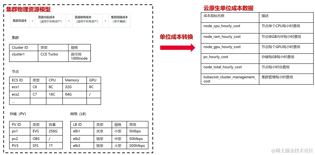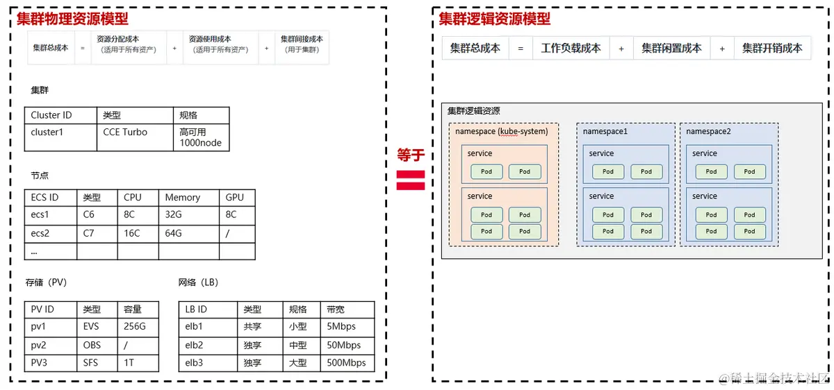 - 集群逻辑资源成本,从kubernetes资源的角度,集群的成本包括工作负载的成本,再加上集群闲置资源成本和公共开销成本。