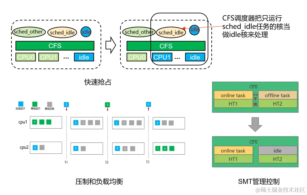 华为HCE 2.0 OS提供的CPU隔离能力,结合CPU快速抢占、SMT管理控制和离线任务压制指令的负载均衡能力,保障在线业务资源QoS同时,也能让被压制的离线任务指令尽量快速得到响应。