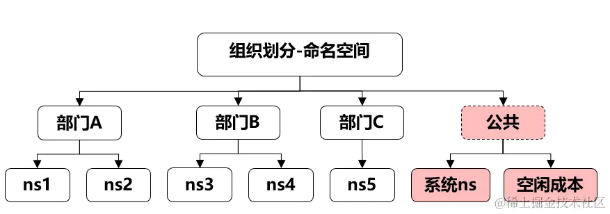 从上图可以看出,部门的成本不仅包括部门归属的命名空间的成本,还应该承担一部分公共成本。这部分功能成本包括系统命名空间成本和空闲资源成本。