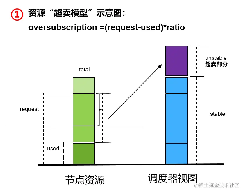 动态超卖的核心原理为:将节点Request和实际使用量的差值部分,作为可调度资源,供调度器重新分配,仅供低优任务使用。