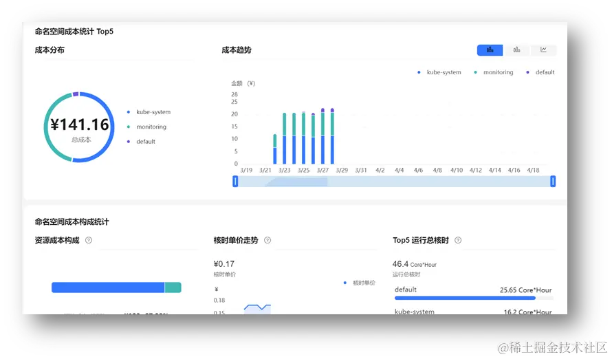 将命名空间下所有的Pod成本累加,就可以得出命名空间维度的成本: