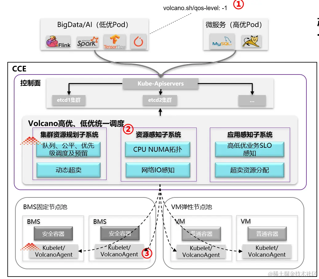 华为云CCE云原生混部解决方案基于volcano插件,支持一键部署,为容器业务提供高低优先级混合部署,动态超卖,服务QoS保障等能力。关键能力主要包括: