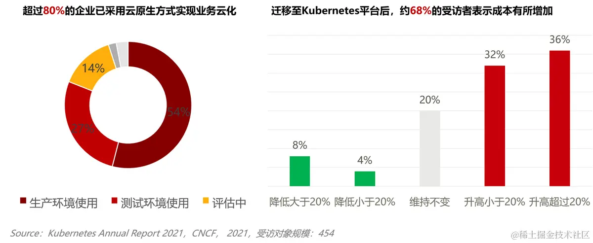 云原生技术当前已经成为很多企业进行数字化转型的主流方式。kubernetes提供的资源共享、资源隔离、弹性调度等能力,本身能够帮助企业提升资源使用率,降低企业IT成本。然而,2021年CNCF《FinOps Kubernetes Report》的调研报告显示,迁移至Kubernetes平台后,68%的受访者表示所在企业计算资源成本有所增加,36%的受访者表示成本飙升超过20%。其背后的原因值得深思。