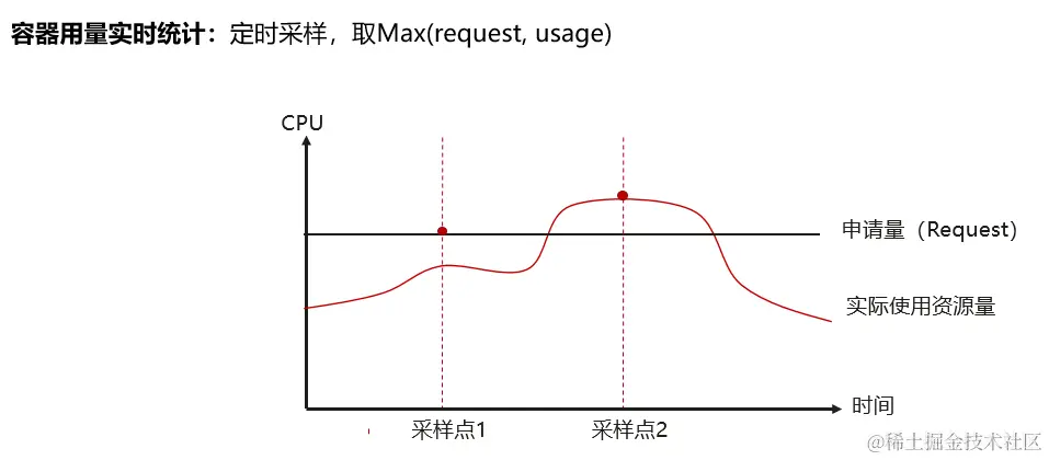 从下图我们可以看出,一个Pod的资源使用是随着时间动态波动。有些时刻Pod的资源占用低于资源申请(Request),有些时刻Pod的资源占用大于资源申请(Request)。在计算Pod成本时,我们会定时采样Pod的实际使用值和Request值,并将实际使用值和Request值中的最大值用于Pod的成本计算。这是因为一旦Request值分配给Pod,那么这不是资源会被K8S预留,不会被其他Pod抢占。所有Pod需要为Request部门的资源买单。同理,如果Pod的实际使用量大于Request,那么这个Pod也需要为超出的部分买单。