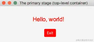 Stage对象指定了主阶段(顶级容器)标题。它还指定了单击窗口上角的关闭窗口符号(x 按钮)的操作。此符号在 Linux 系统上显示在左侧,在 Windows 系统上显示在右侧