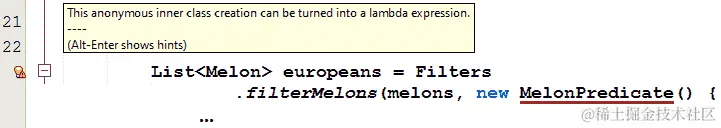 新的一天,新的想法!任何智能 IDE 都可以为我们指明前进的道路。例如,NetbeansIDE 将不连续地警告我们,这个匿名类可以作为 Lambda 表达式编写。