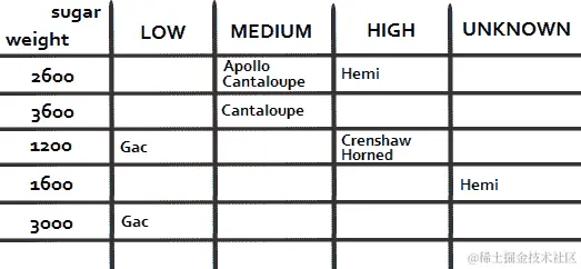 现在,假设我们想按重量和类型对列表进行排序。换言之,当两个瓜的重量相同时(例如,Horned (1600g)、Hemi(1600g),它们应该按类型分类(例如,Hemi(1600g)、Horned(1600g))。朴素的方法如下所示:
