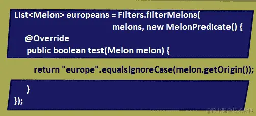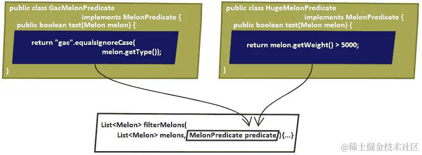 这样好多了!我们可以通过以下不同的行为重用此方法(这里,我们传递GacMelonPredicate和HugeMelonPredicate: