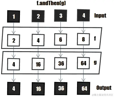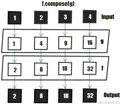 在本例中,g函数应用于其输入(4)。应用g的结果是 16(g(4) = Math.pow(4, 2)。这个结果是第二个函数f的输入。应用f的结果为 32(f(16) = 16 * 2)。下图描述了四个输入的流程–1、2、3和4: