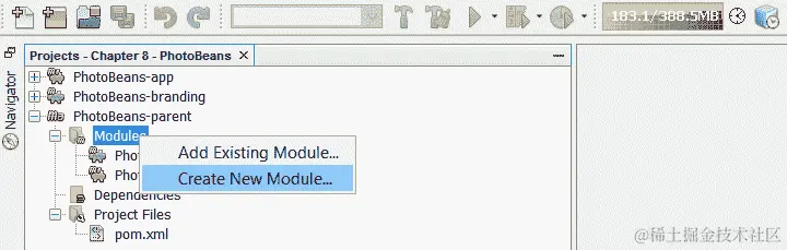 通常接受的模式是,将 API 类放在一个模块中,将实现放在另一个模块中。这样可以使其他实现者重用 API 类,可以通过隐藏私有类来帮助强制低耦合等等。然而,为了简化我们学习平台的过程,我们将创建一个模块,该模块将提供所有核心功能。为此,我们右键单击父项目下的“模块”节点,然后选择“创建新模块...”:如下图所示: