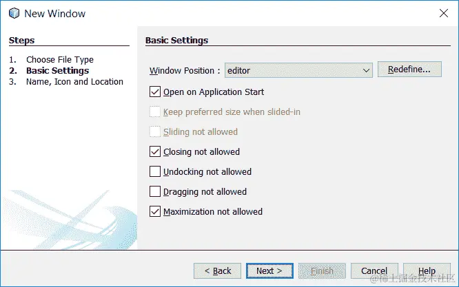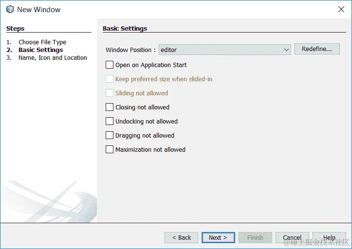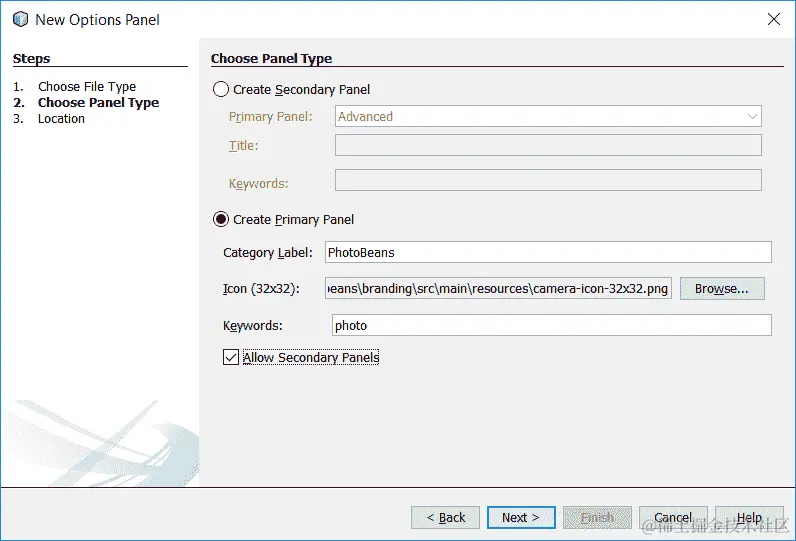 规范页面有大量的额外信息,但现在这些信息足够让您开始了。我们希望我们的照片列表在应用程序窗口的左侧,所以我们选择窗口位置为编辑器。点击“下一步”,我们配置组件的名称和图标。严格来说,我们不需要为 TopComponent 指定图标,所以我们只需输入PhotoList作为类名前缀,并点击“完成”: