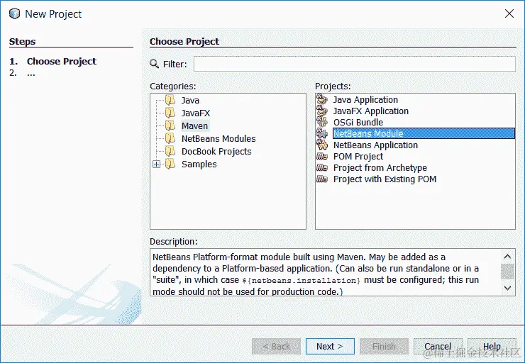 一旦选择,您将看到新项目窗口。在这里,您需要选择 Maven 类别和 NetBeans 模块项目类型,如下所示: