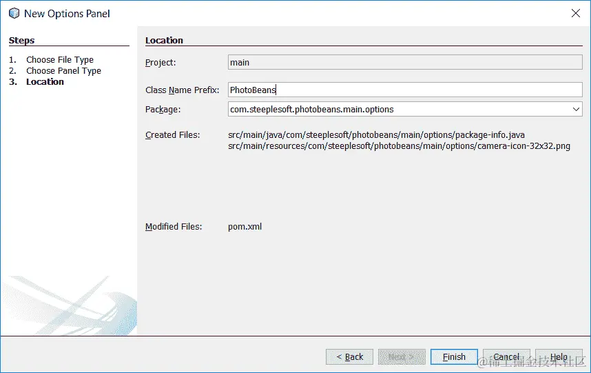 在新项目窗口中,我们选择 Maven,然后选择 NetBeans Application。在下一个屏幕上,我们像往常一样配置项目,指定项目名称、photobeans、项目位置、包等。
