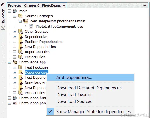如果我们现在运行我们的应用程序,我们不会看到任何变化。因此,我们需要在应用程序中添加对main模块的依赖。我们可以通过右键单击应用程序模块的“Dependencies”节点来实现这一点,如下图所示: