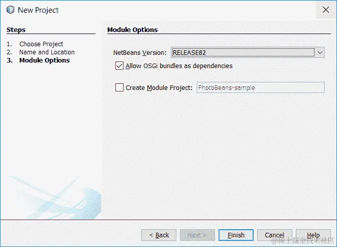 在撰写本文时,最新的平台版本是 RELEASE82。到 Java 9 发布时,可以合理地期望 NetBeans 9.0,因此 RELEASE90 将可用。我们希望使用最新版本,但请注意,根据 NetBeans 项目的发布计划,它很可能 不 是 9.0。对于“允许将 OSGi 捆绑包作为依赖项”选项,我们可以安全地接受默认值,尽管更改它不会给我们带来任何问题,而且如果需要,我们可以很容易地稍后更改该值。