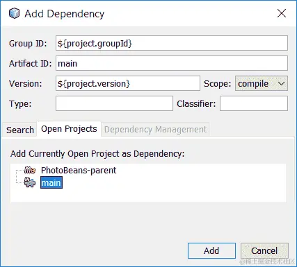 现在您应该看到“添加依赖项”窗口。选择“打开项目”选项卡,然后选择main,如下图所示: