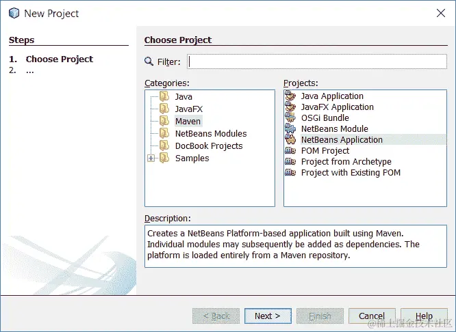 您如何创建 NetBeans RCP 项目将对项目的其余部分的处理方式产生非常基本的影响。默认情况下,NetBeans 使用 Ant 作为所有 RCP 应用程序的构建系统。几乎所有来自 NetBeans 项目的在线文档和 NetBeans 传道者的博客条目也经常反映了这种偏好。我们一直在使用 Maven 进行其他项目,这里也不会改变。幸运的是,NetBeans 确实允许我们使用 Maven 创建 RCP 项目,这就是我们要做的。
