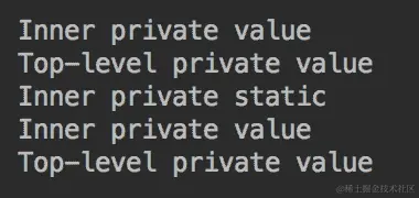 输出的前两行来自topLevelPrivateMethod(),其余来自main()方法。如您所见,内部类和顶级类可以访问彼此的私有状态,从外部无法访问。