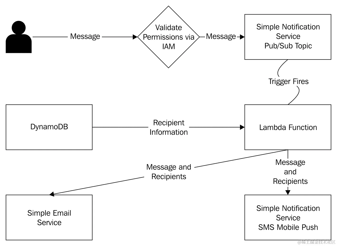 我们将构建的应用程序是一个非常简单的云通知服务。简而言之,我们的函数将监听消息,然后将这些消息转发到系统中注册的电子邮件地址和电话号码。虽然我们的系统可能有些牵强,当然非常简单,但希望更实际的用例是清楚的: