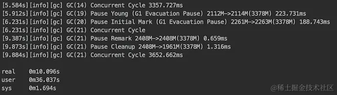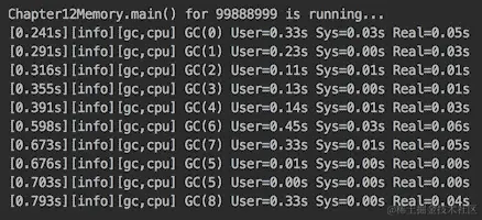 我们的计算机是多核的,因此 JVM 能够并行利用多个核心,很可能是用于垃圾收集。这就是为什么用户时间比实际时间长,系统时间也因同样的原因比实际时间长。