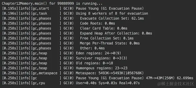 首先,我们将使用默认的垃圾收集器运行前面的程序: