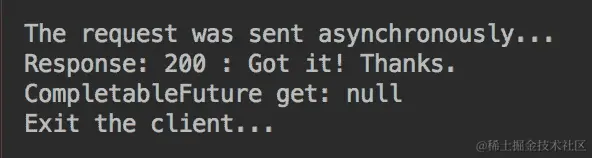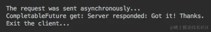 现在,get()方法按预期返回服务器的消息,它由函数表示并作为参数传递给thenApply()方法。