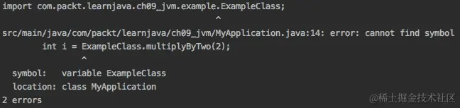 这意味着编译器找不到ExampleClass.class文件。我们需要编译它并放在类路径上: