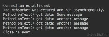 前面的代码使用WebSocket.Builder类创建WebSocket对象。buildAsync()方法返回CompletableFuture对象。CompletableFuture类的join()方法在完成时返回结果值,或者抛出异常。如果没有生成异常,那么正如我们已经提到的,WebSocket通信将继续,直到任何一方发送关闭消息。这就是为什么我们的客户端等待 200 毫秒,然后发送关闭消息并退出。如果运行此代码,将看到以下消息:
