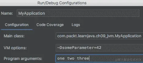 程序参数字段允许在java命令中设置参数。例如,我们在这个字段中设置one two three: