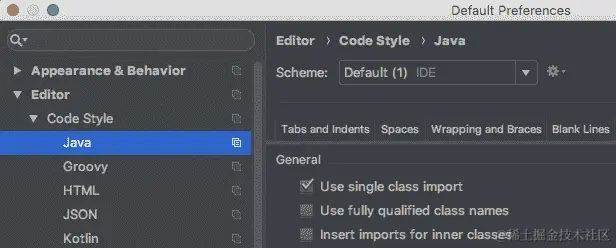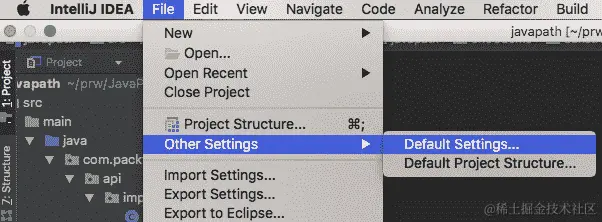 在 IntelliJ IDEA 中,默认的导入风格是使用通配符。如果你想切换到单个类导入,请点击 文件 | 其他设置 | 默认设置,如下面的截图所示: