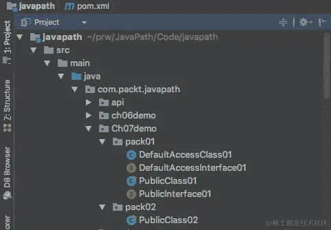 正如您所知道的,包名反映了目录结构,从包含.java文件的项目目录开始。每个.java文件的名称必须与其中定义的公共类的名称相同。.java文件的第一行是以package关键字开头的包声明,其后是实际的包名称——本文件的目录路径,其中斜线替换为句点。让我们看一些例子。我们主要关注包含类定义的.java文件,但我们也会看一些带有接口和enum类定义的文件,因为特殊的导入类型(称为静态导入)主要用于接口和enum。