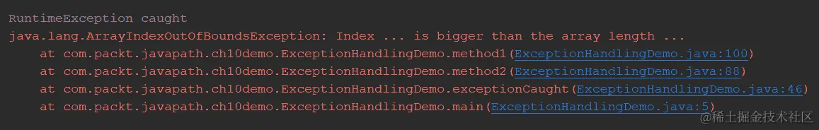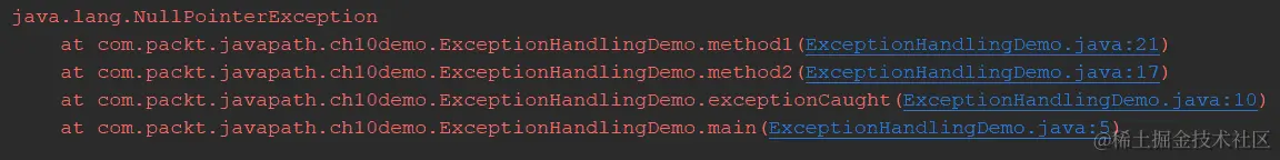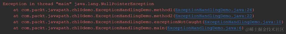 每个异常都可以被自动(由 JVM)抛出,或者由应用程序代码使用throw关键字。方法调用者可以使用异常语句捕获异常,并根据异常类型和它(可选地)携带的消息执行某些操作,或者让异常进一步传播到方法调用堆栈的更高层。