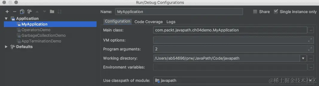 我们已经设置了java命令选项-Xlog:gc和环境变量myprop1=whatever。IDE 将使用这些设置来形成以下java命令: