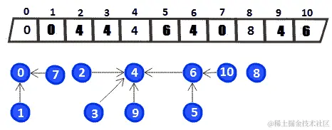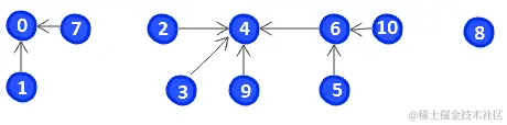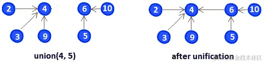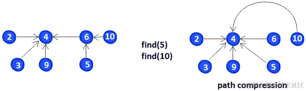 在左侧,在寻找5的父代时,必须经过6直到4。同样,在寻找10的父代时,必须经过6,直到4为止。然而,在右侧,我们通过直接链接到4来压缩5和10的路径。这一次,我们不需要通过中间元素就可以找到5和10的父代。