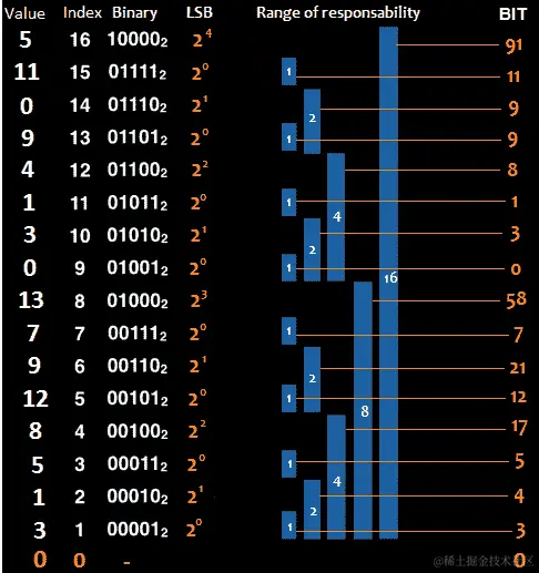 构建位的想法依赖于最低有效位(LSB)概念。更准确地说,假设我们正在处理索引中的元素,a。那么,紧靠我们上方的值必须位于索引b,其中b = a + LSB(a)。为了应用该算法,索引 0 的值必须是 0;因此,我们操作的数组如下: